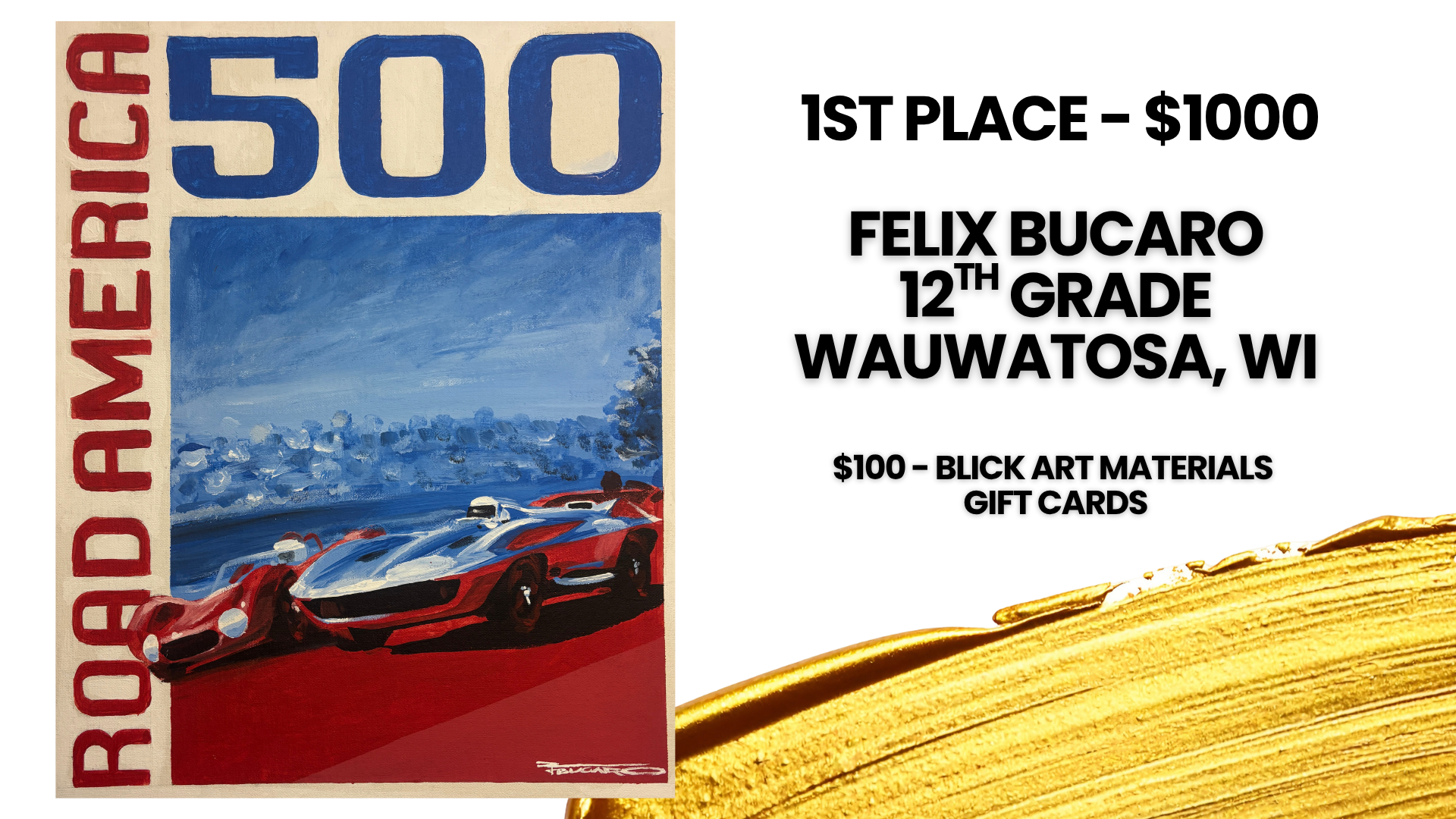 1st place winner: $1000 Cash Prize + $100 In BLICK Art Materials Gift Cards