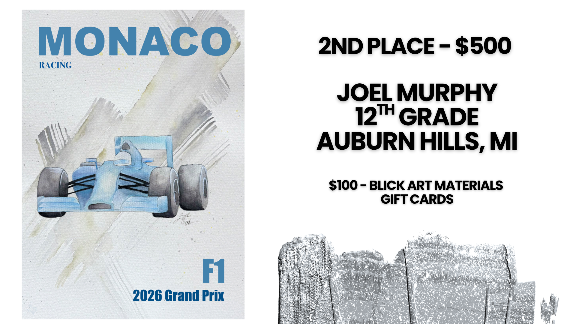 2nd place winner: $500 Cash Prize + $100 In BLICK Art Materials Gift Cards